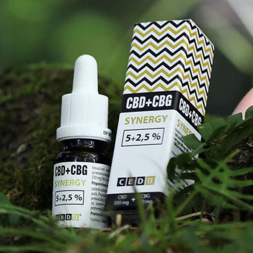 CBD+CBG kapljice SYNERGY 5%+2.5% so inovativni prehranski dodatek, ki vsebuje fitokompleks naravnega izvlečka in aromo konopljinih cvetov, od tega 500 mg CBD in 250 mg CBG, vitamin D in sončnični lecitin.